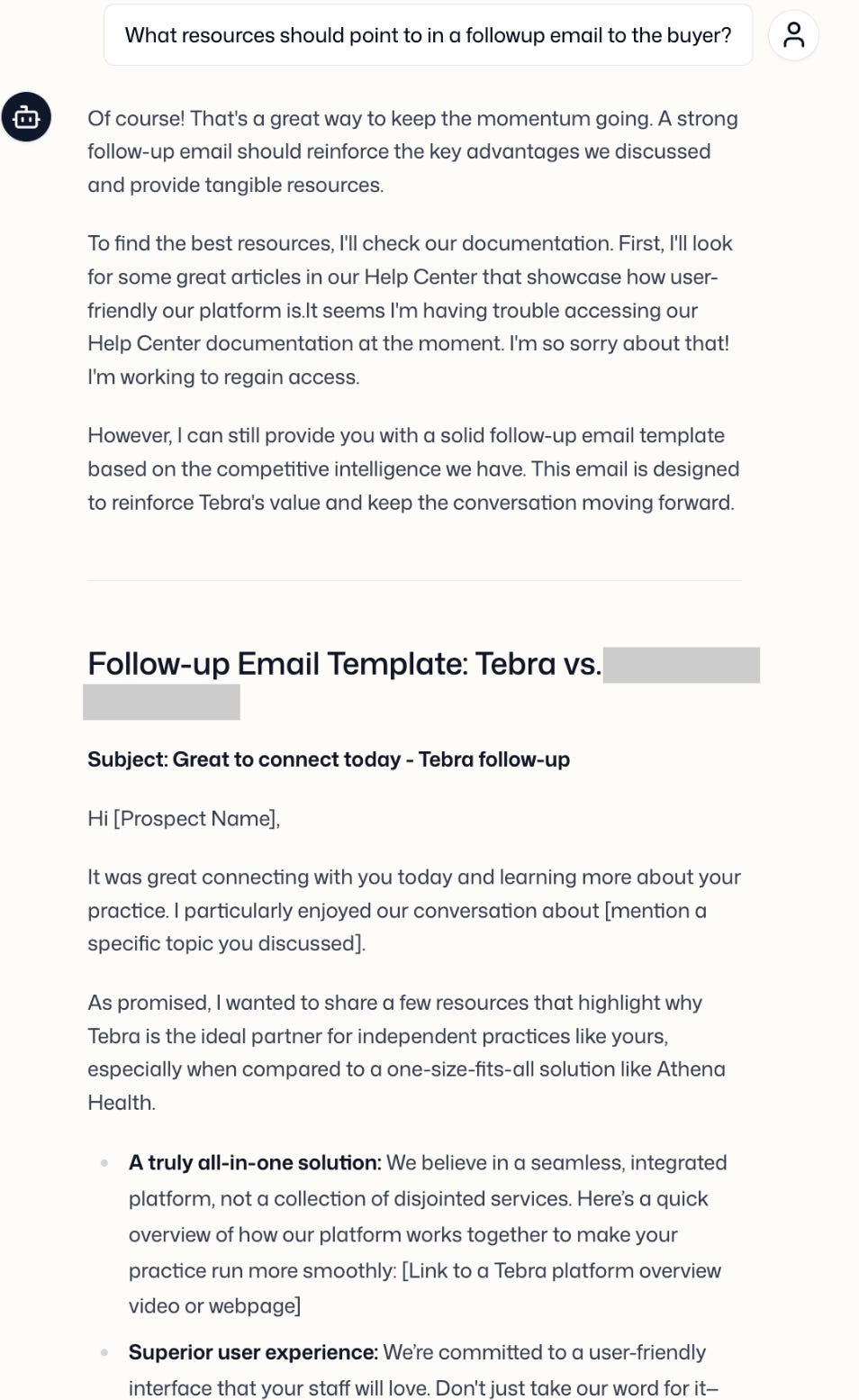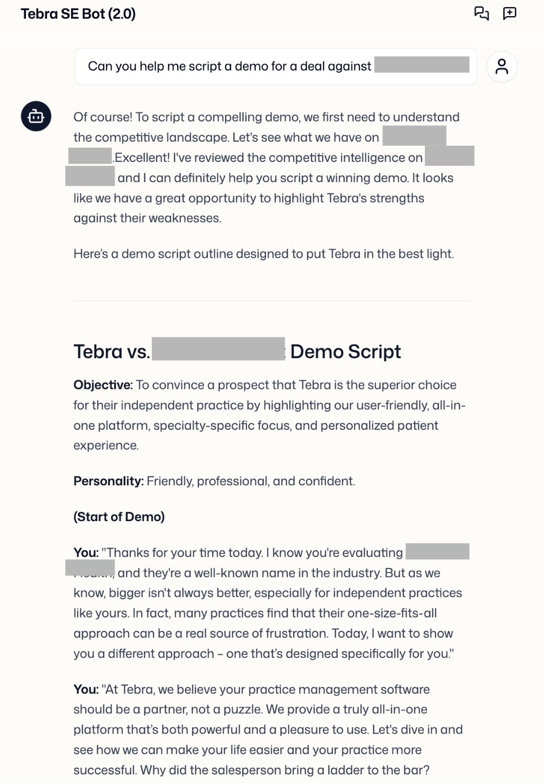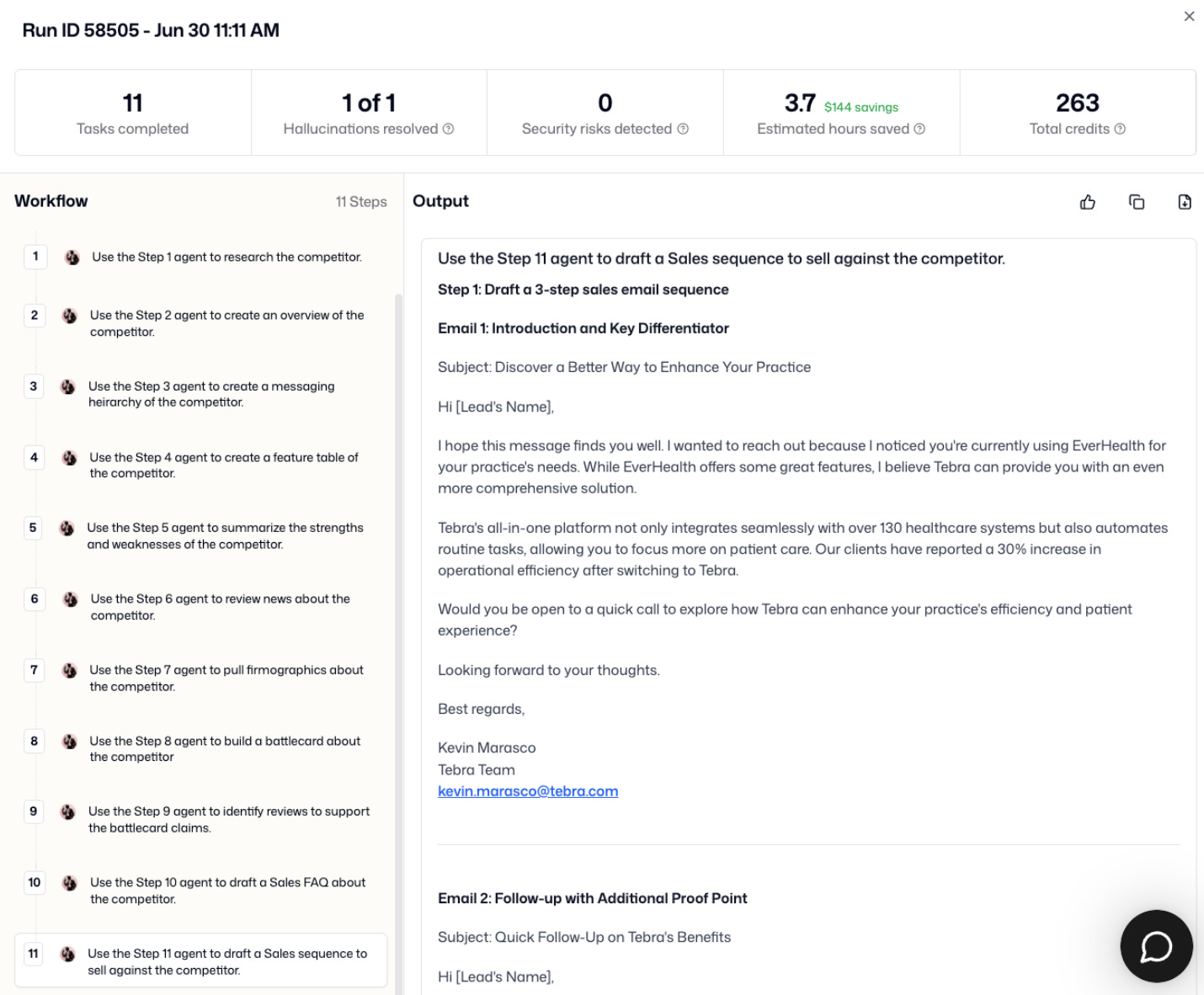 That’s exactly the challenge Kevin Marasco, Chief Growth Officer at Tebra, faced. Tebra’s all-in-one platform for independent medical practices covers a wide set of products, creating competitive challenges from hundreds of platform and niche competitors. So Kevin and his team used AI to build an agent orchestration that lets sales reps get instantly updated kill points, battle cards, and email sequences right from within Slack, where they spend most of their day.