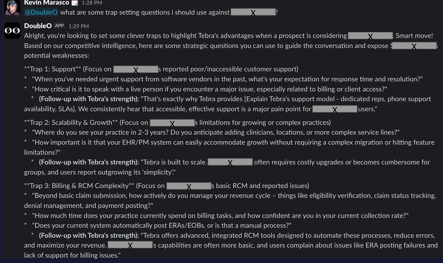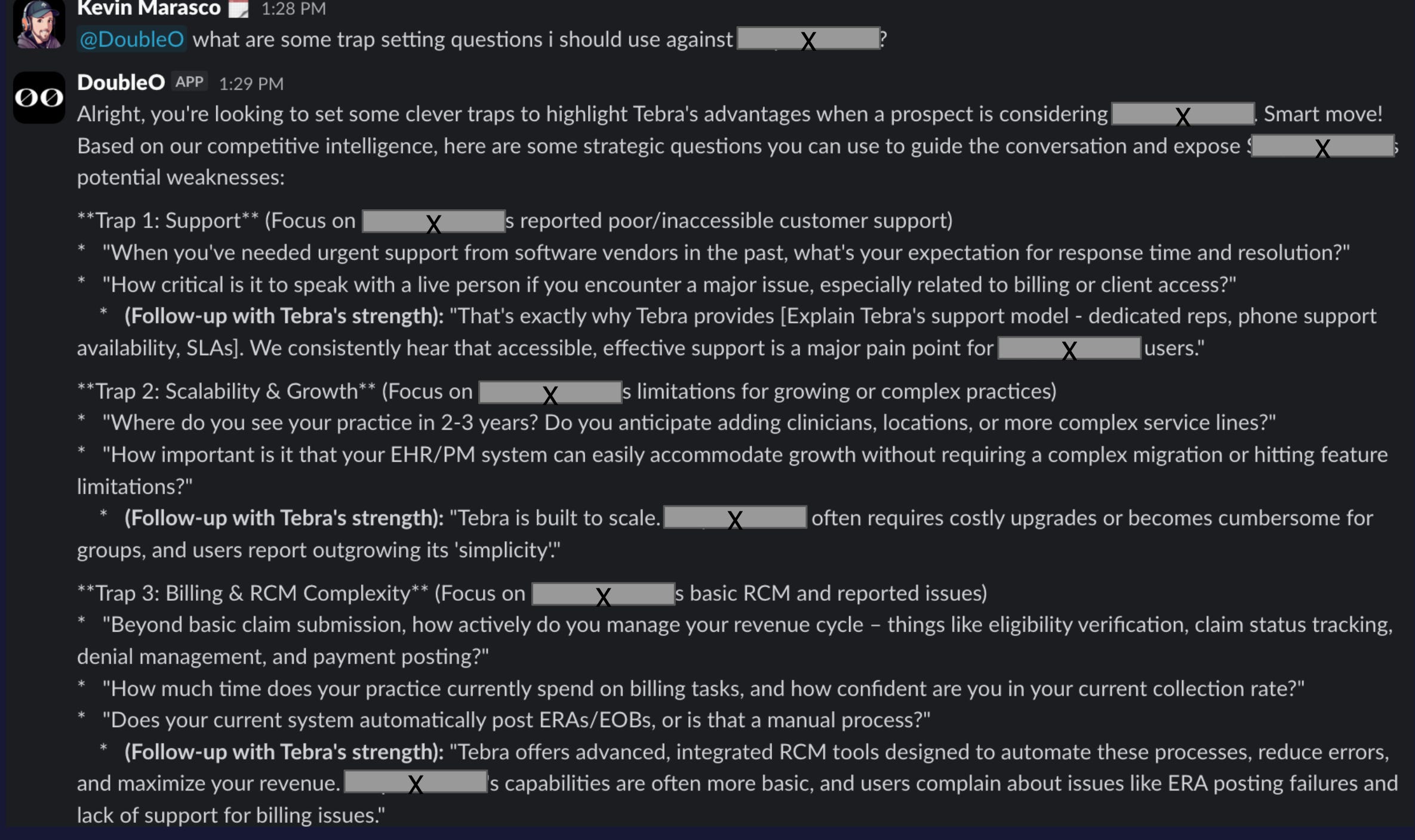 Here’s a screenshot of some specific competitor trap-setting questions generated by the flow fed right into Slack