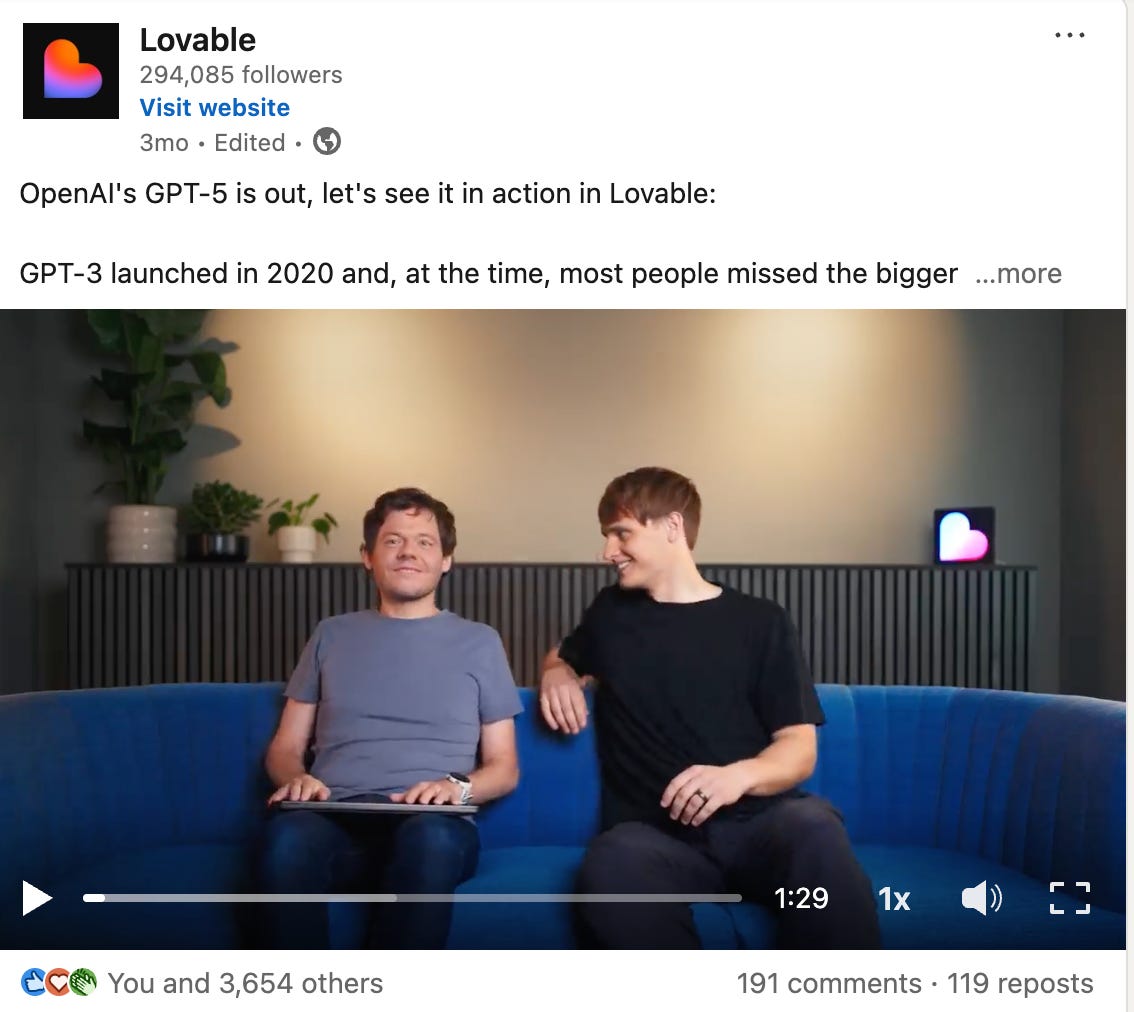 Lovable employees comment, like, and reshare posts quickly to spark algorithmic momentum - and for big announcements, engage groups of colleagues, friends, and family to share the love. It’s a highly intentional, coordinated social motion that compounds every announcement.