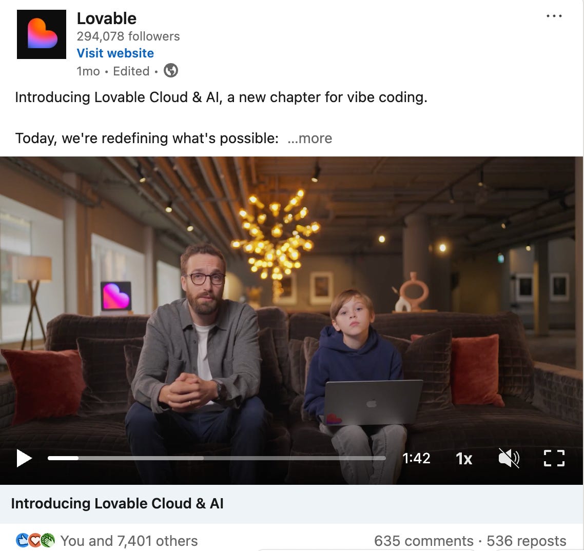 Lovable’s early visibility didn’t come from paid campaigns. It came from storytelling and social dominance. They built early momentum on X and YouTube, then expanded on LinkedIn, Instagram, and TikTok, mixing first-party storytelling, customer showcases, and influencer collaborations. Posts are a combination of real use cases (and ROI) created on Lovable, hype for community events, thoughts on AI trends, highlights of new team members, and some controversial takes. (An early mega-viral post suggested that Lovable buy Figma, when Lovable was still tiny.)
