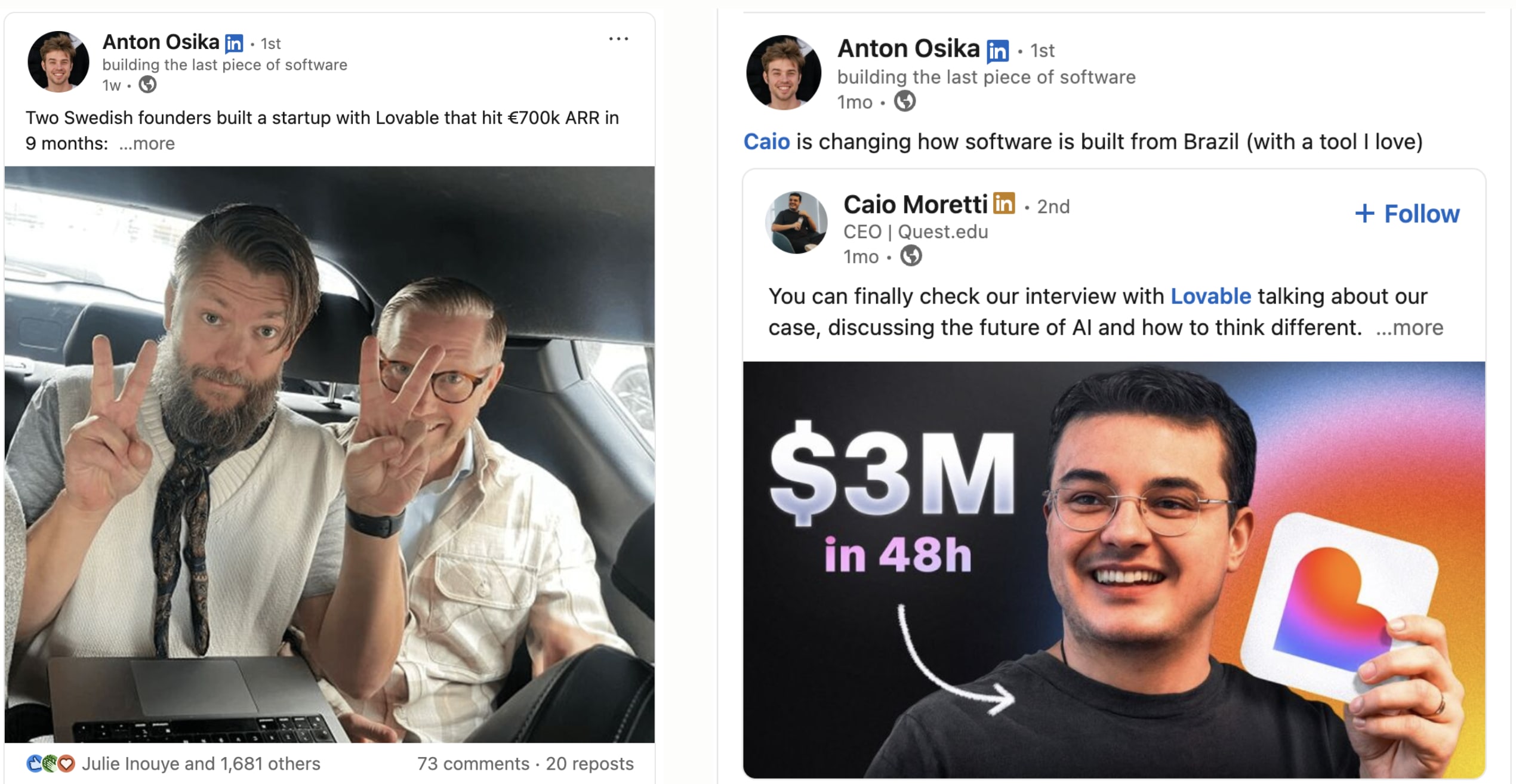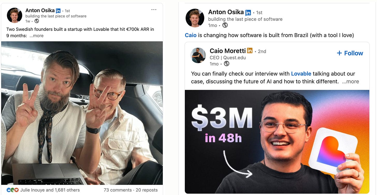 The CEO, Anton Osika, is a social force of nature, with big ideas and a dedicated, mind-melded social media partner. This person’s eye for what will go viral, his boldness, testing mentality, and care for every word have driven great momentum and visibility for Anton and for Lovable’s brand social.