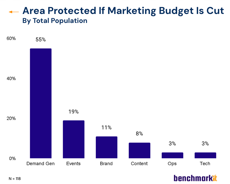 Pipeline pressure is intense, and when budgets tighten, demand gets protected. 55% of leaders say they would fight hardest to preserve demand spend if cuts were required. Only 11% would protect brand.