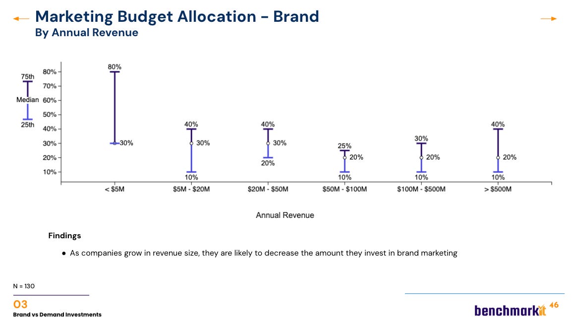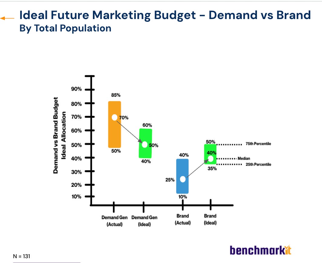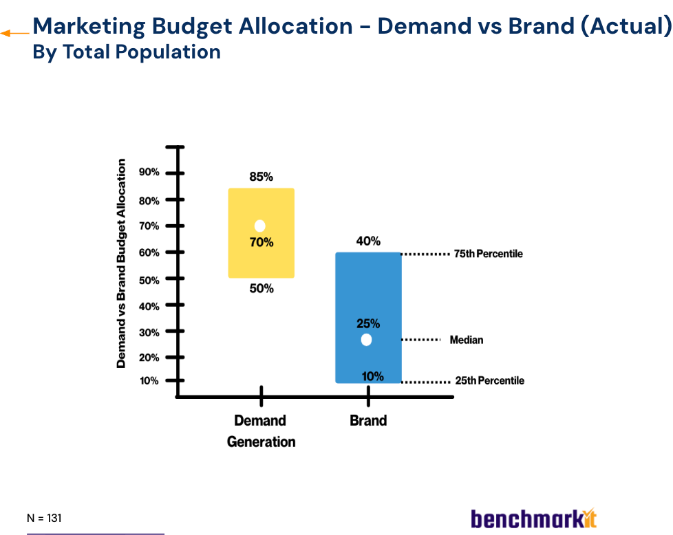 Today, the median marketing budget allocation is ~70% demand generation and ~25–30% brand.