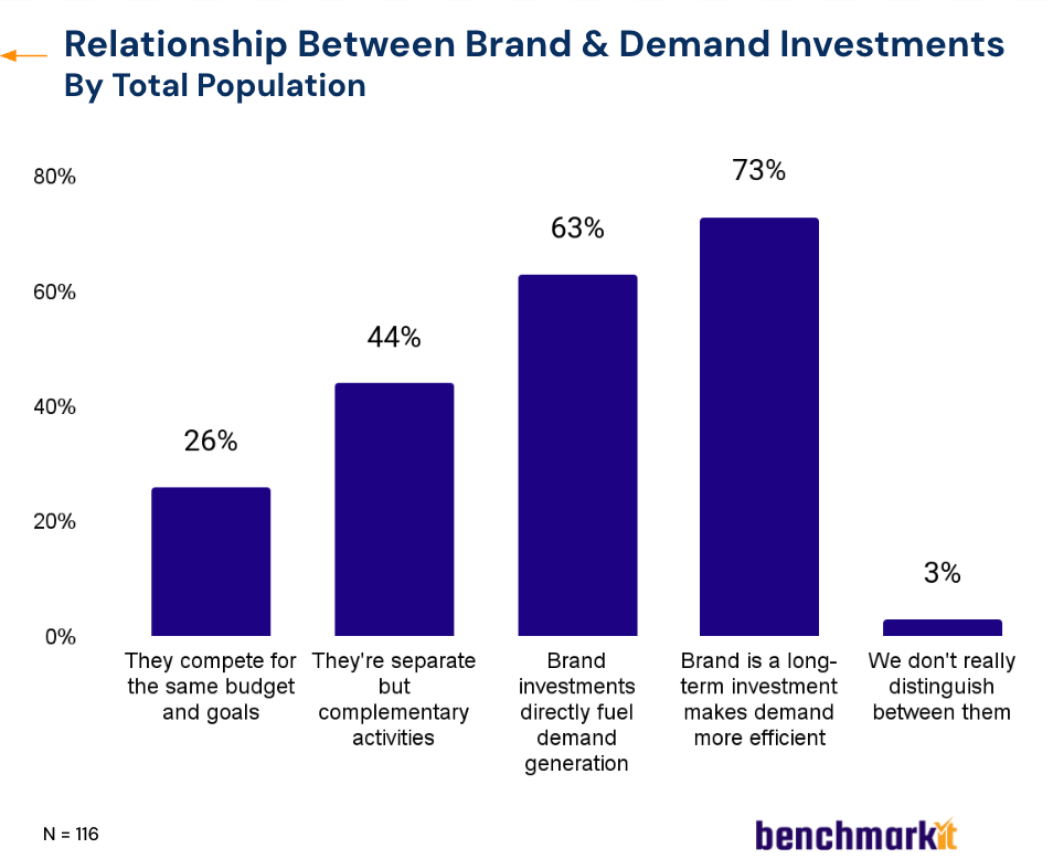 Even more telling, 73% believe brand investment makes demand generation more efficient, and 63% say brand directly fuels demand.