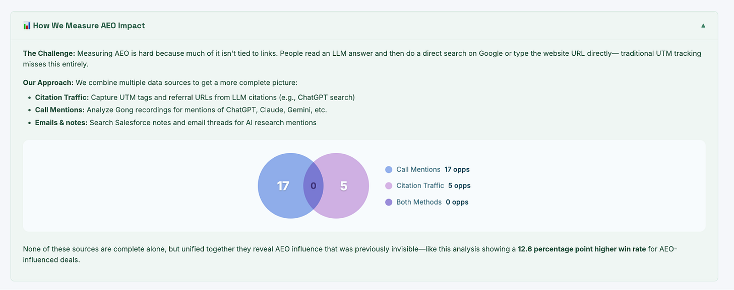 Measuring things that were impossible: AEO influence on pipelines is incredibly hard to measure because people don’t click on links. But in many cases prospects mention how they heard about you on calls or in forms. By combining citation traffic, call mentions, and email threads, Assembled tracked actual AEO influence on the pipeline.