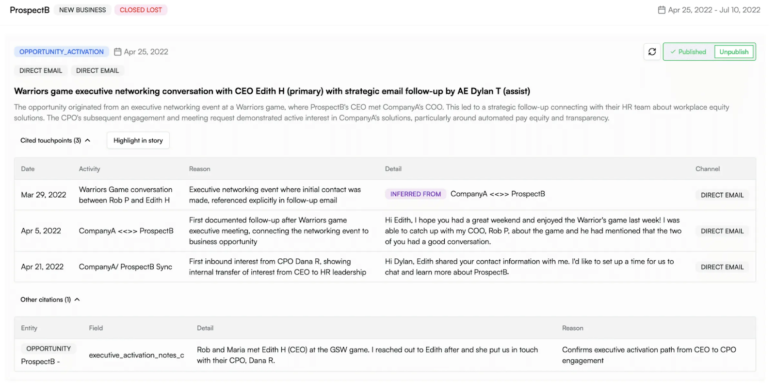 What actually activated this deal? Example: “The inflection point was a partner referral to the CFO, followed by an internal forward chain we wouldn’t have seen in CRM.”