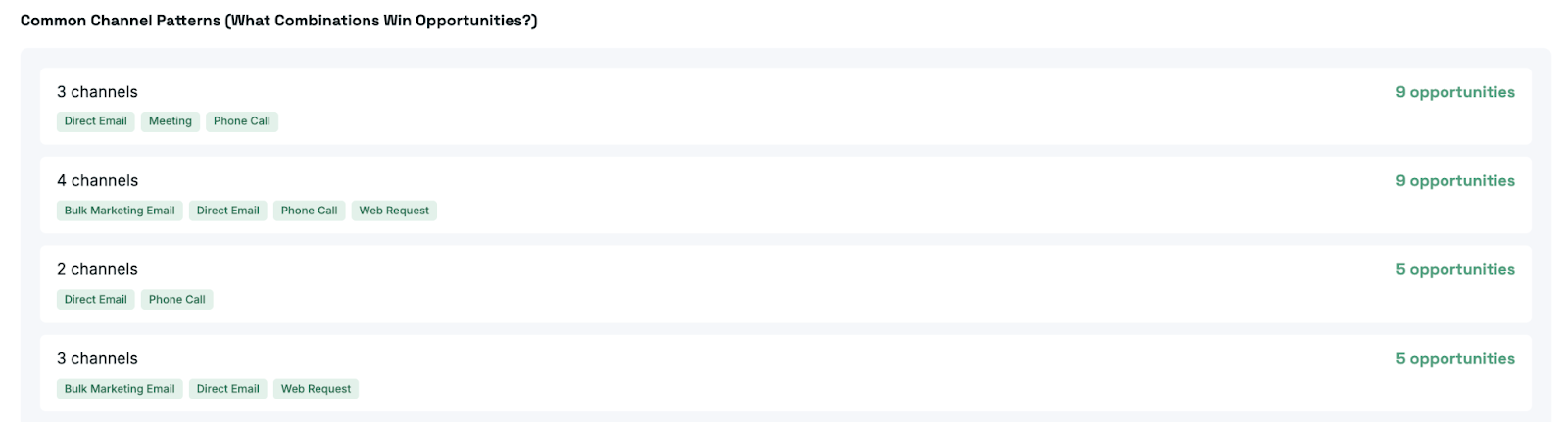 What sequences lead to new opportunities? Example: “Deals that start with content engagement + SDR outreach convert at 2x the rate of cold outbound alone.”