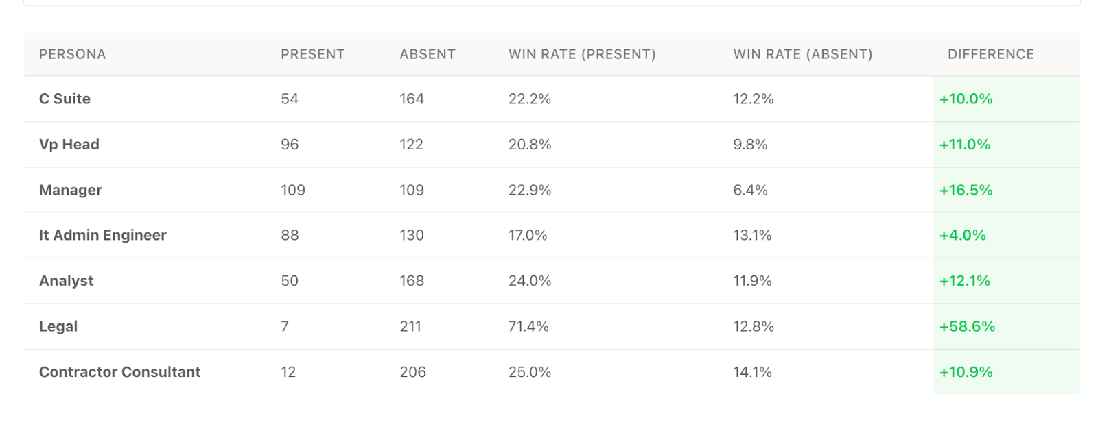 Image: Example of persona presence detected in buying groups (beyond contact roles in Salesforce) by Upside and impact on win rates.