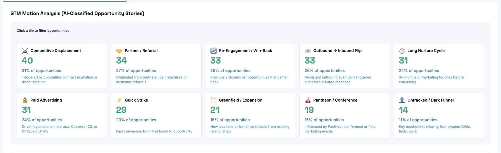 The AI paradigm shift: AI has enabled teams to stop forcing deals into attribution models and start answering specific questions about each deal. Then aggregate those answers into insights and recommendations.