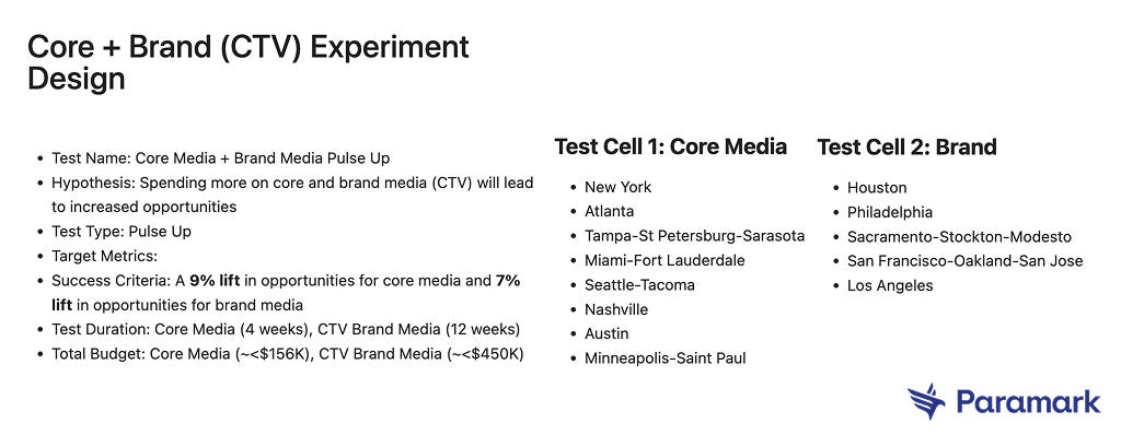 One of the biggest mistakes teams make is expecting instant results from brand investment. A proper test requires weeks or months of setup, depending on your exact hypothesis and volumes. Below is an example of a statistically valid test design for a top B2B brand we work with.-
