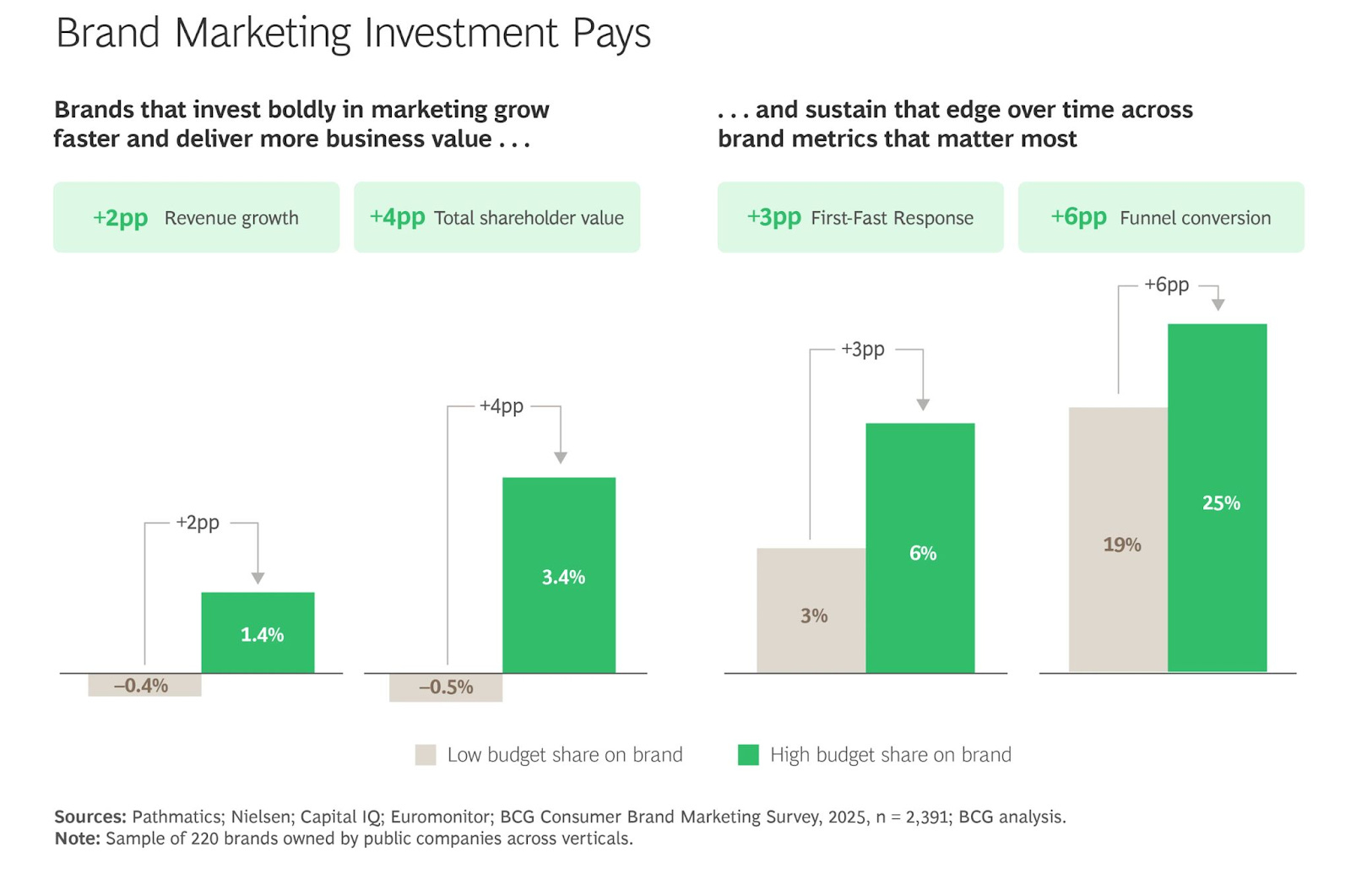 Uplift from brand investments is, of course, dependent on the amount of spend relative to the target audience and duration, but a brand analysis by BCG found that companies that invested in brand and sustained that investment saw: +2% increase in revenue,+4% boost in shareholder return, and +6% increase in funnel conversion: