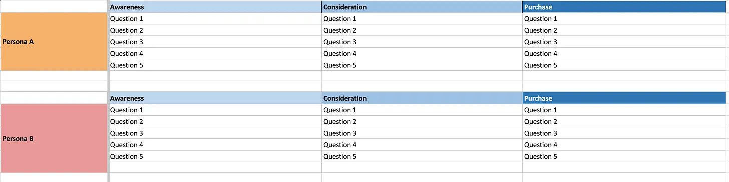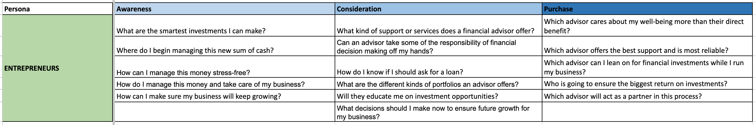 Let’s assume you’ve already identified the key personas in your buying committee. Before mapping content, you need to map the questions the buyers are trying to answer at each stage of their journey. Not generic questions. Here’s an excerpt from a content strategy of a wealth management firm - notice the specificity of questions to the stage and product: