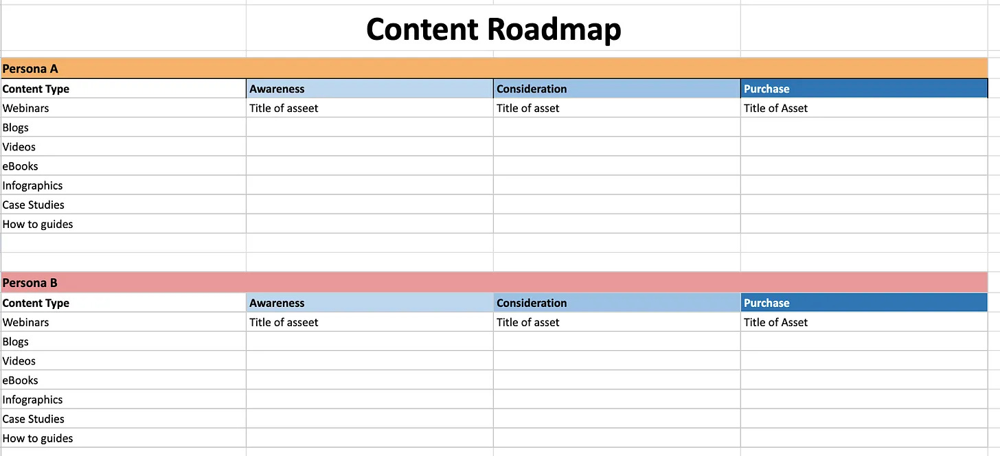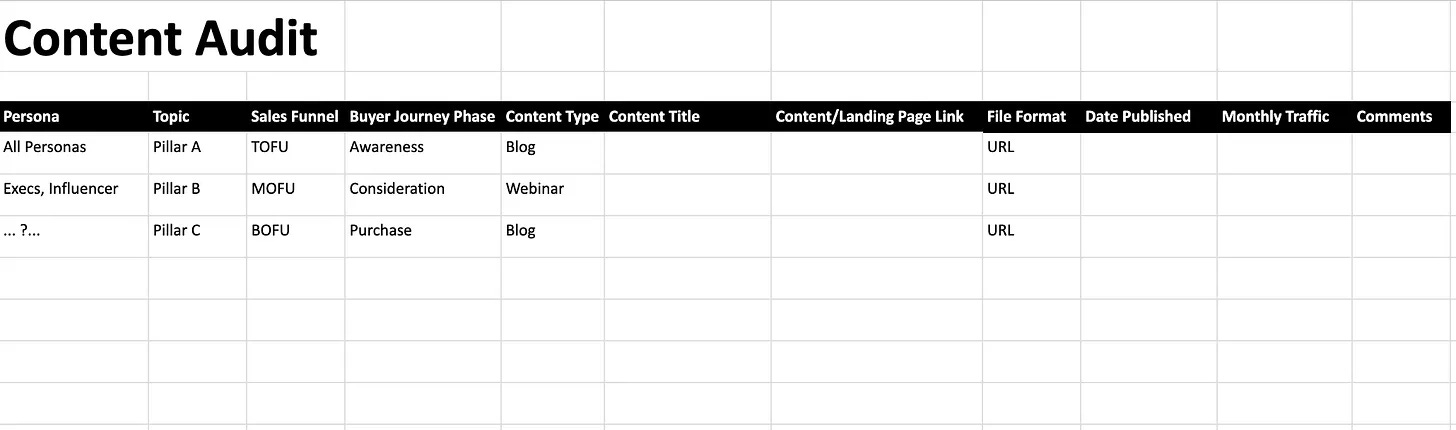 Most marketing teams have vast troves of content, but little understanding of how their coverage is across personas and stages of the buying funnel. A simple audit helps wrangle the chaos and start to systematically assess how effective the whole corpus of content is. A simple audit should capture: