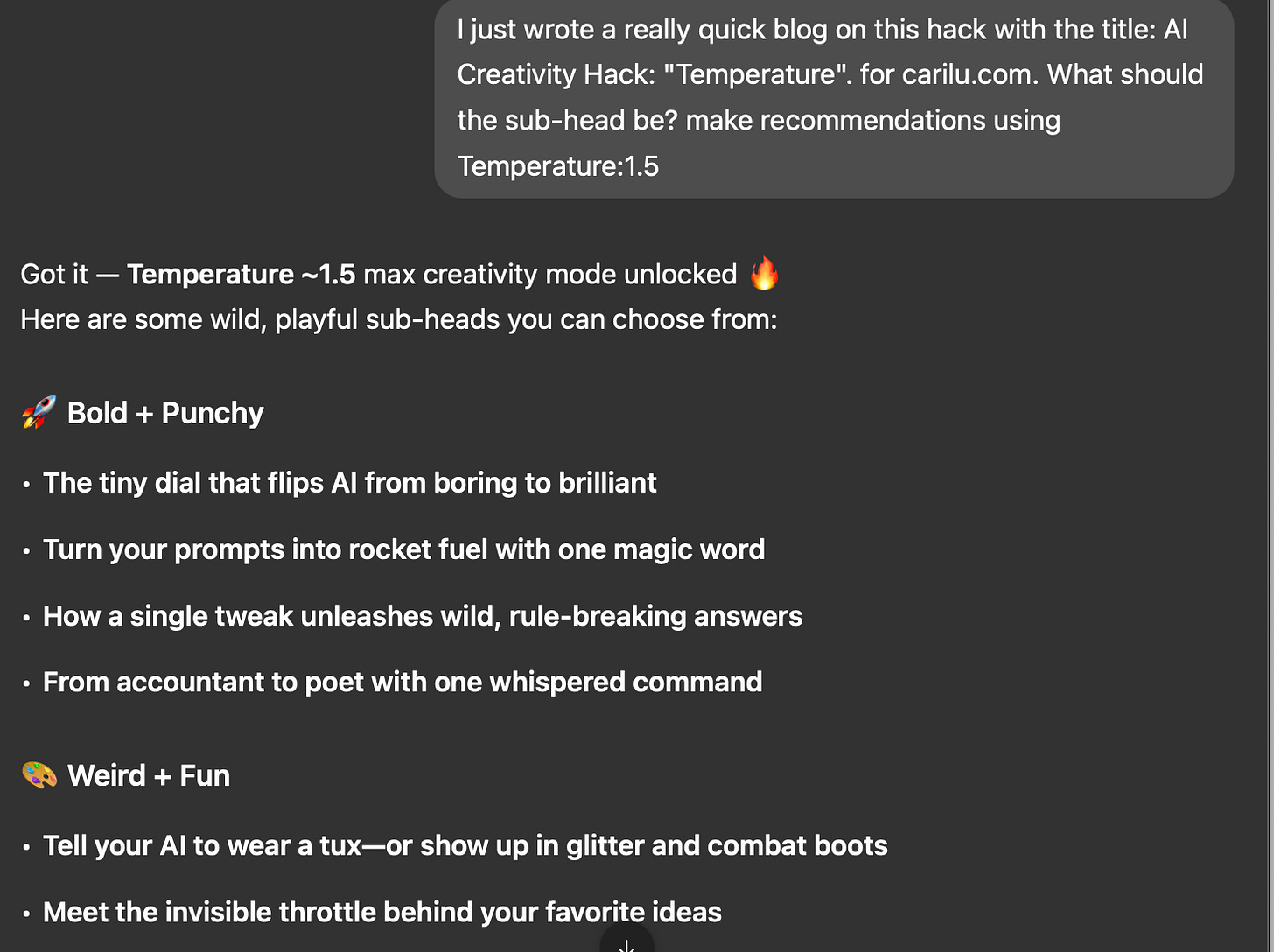 Did you know you can tune LLMs manually on a scale of creativity to correctness? News to me! I just learned about “temperature.” If you’re not using this already, read on for the details on how to use it in ChatGPT, Claude, and Gemini. I can’t get enough. I’m 1.5ing everything. I might finally become funny.