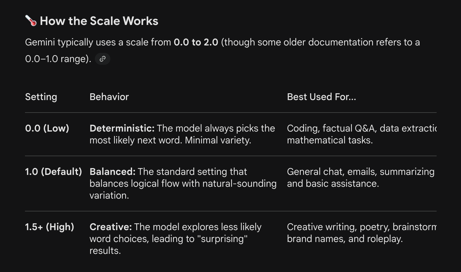 Gemini describes Temperature as a dial between predictability and imagination.