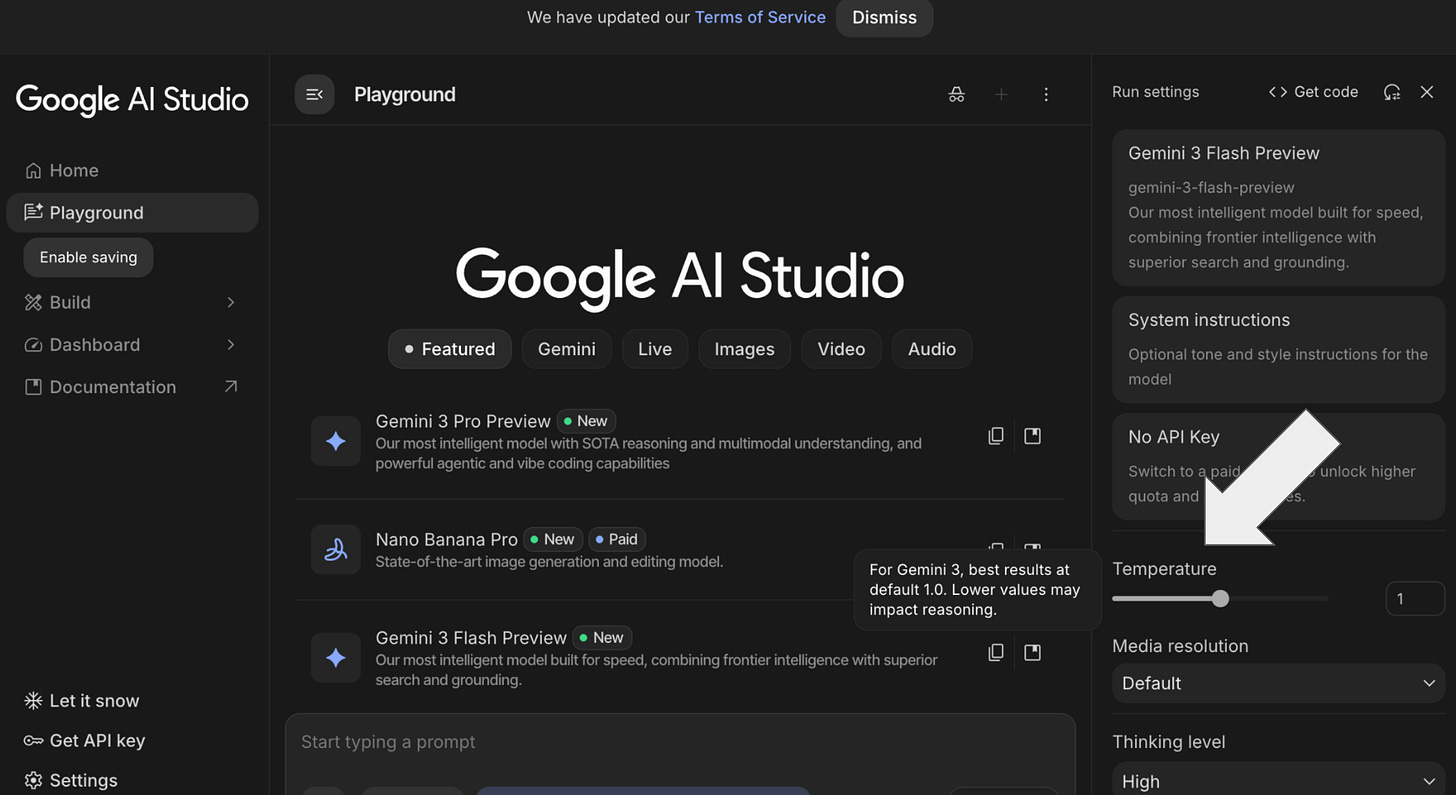 Use “Thinking” Levels Instead: Instead of lowering temperature for accuracy, try adjusting the Thinking Level (low, medium, or high) in the API settings. High thinking provides better accuracy without the risks of manual temperature tuning.