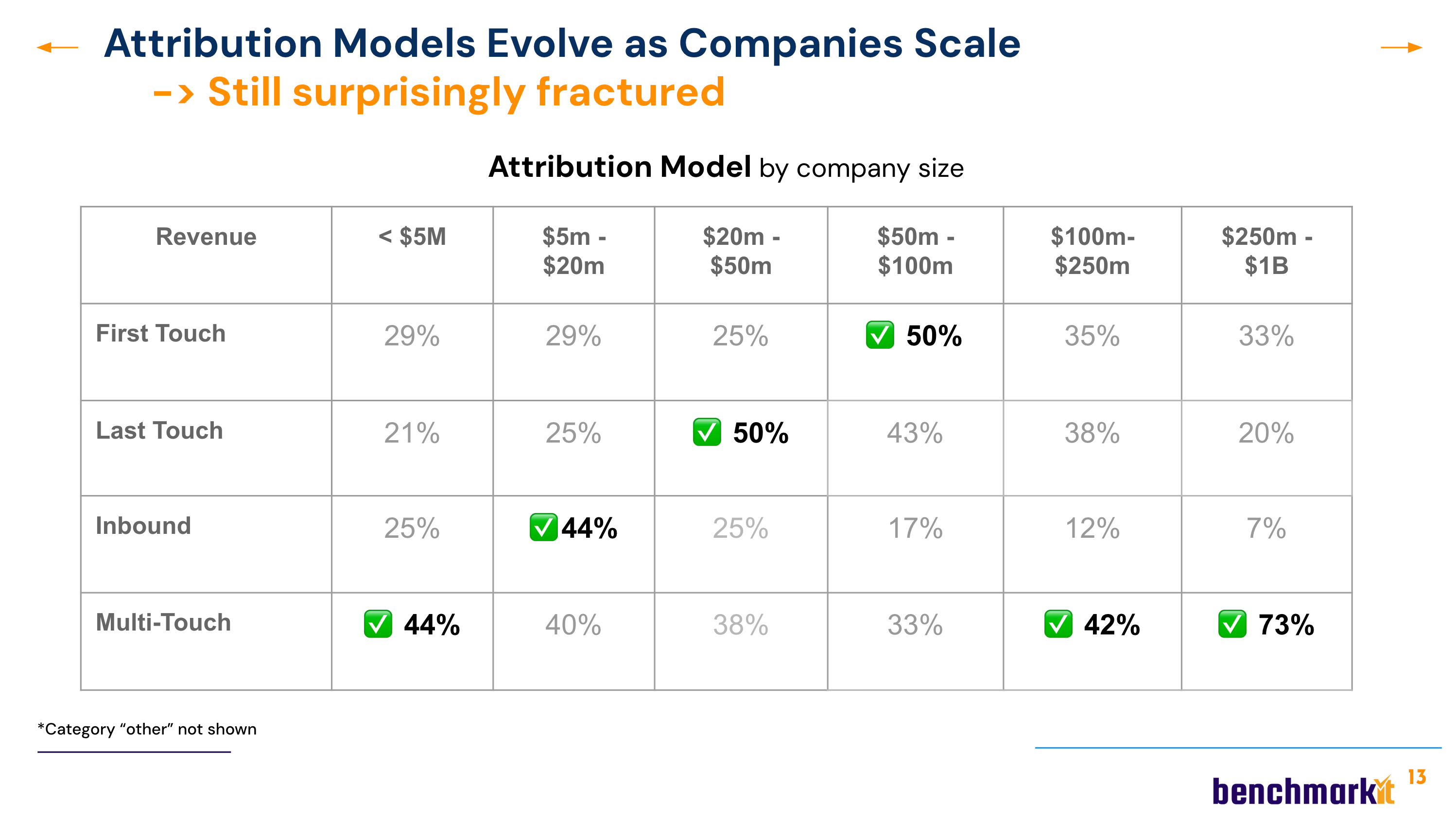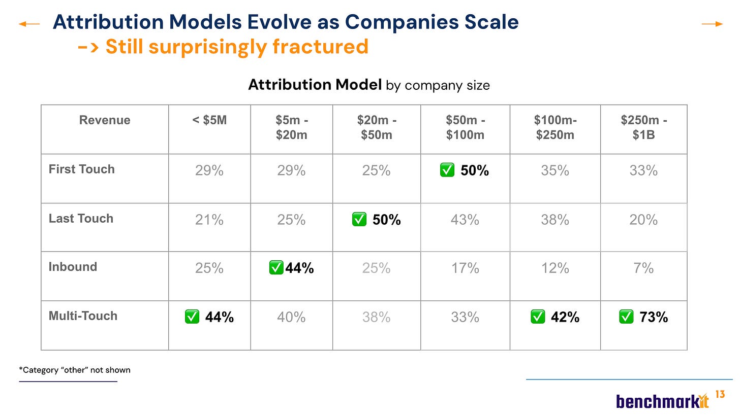 Scaled companies predominantly use Multi-Touch Attribution, which looks at the entire journey. They may also use first and last touch as part of their multi-model strategy to answer different questions: Where do people first find us? Where do we capture them before they convert to opportunity? The combination of these is then used to set investment recommendations and provide blended cost/revenue insights.