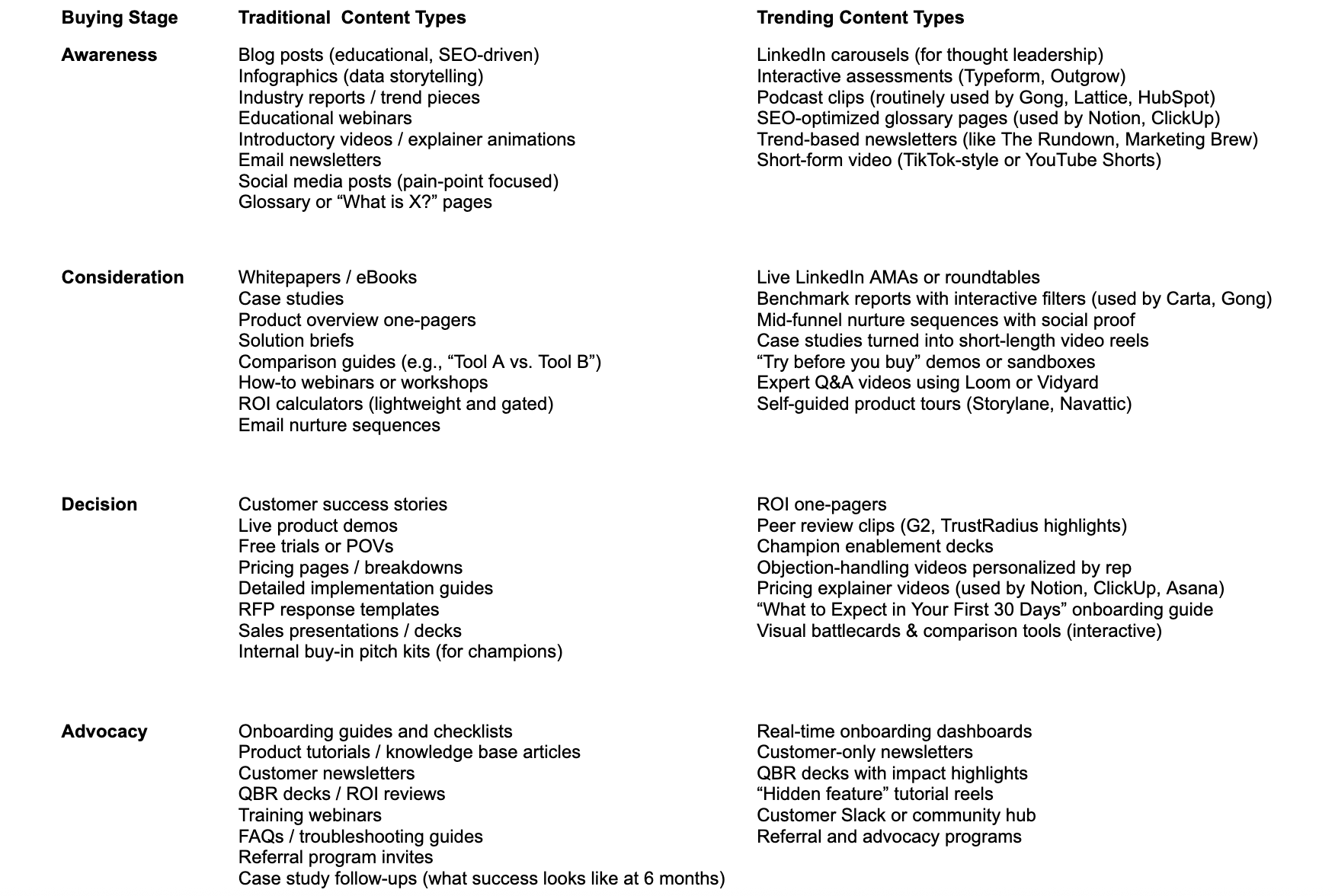 The chart below outlines how different content types map to stage and context. Use it to pressure-test your plan, not to expand your production list.
